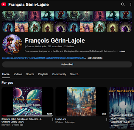 Most of François' original compositions from the past 20 years have found their way onto his YouTube channel. You'll find various compilations, collections and albums on the Playlist tab. Be sure to SUBSCRIBE to the channel, LIKE the videos you enjoy and COMMENT in the comments section. By doing so, you are participating in the broad video game music community, supporting his art and showing YouTube that his music is worth spreading.